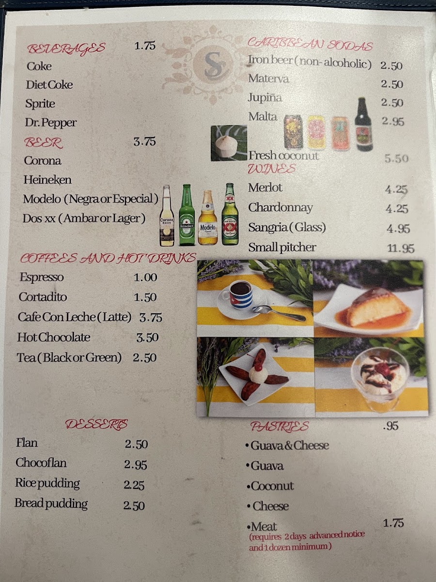 Beverage offerings include traditional Cuban drinks such as Cafe Con Leche and soda options like pineapple soda, suitable for casual dining or coffee breaks.